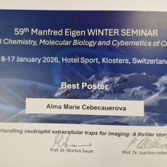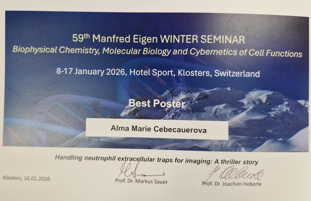 Významného úspěchu dosáhla Alma Marie Cebecauerová, která pod vedením Kateřiny Paldusové získala ocenění Best Poster na prestižní mezinárodní konferenci 59th Manfred Eigen Winter Seminar – Biophysical Chemistry, Molecular Biology and Cybernetics of Cell Functions. Alma Marie Cebecauerová je čtrnáctiletá praktikantka našeho ústavu, která studuje na Arcibiskupském gymnáziu v Praze. Konference se konala ve dnech 8.–17. ledna 2026 v Klosters ve Švýcarsku.
