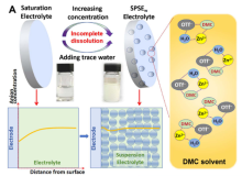 Salt particle suspension electrolyte with trace-water for improving ionic concentrations at interfaces in zinc-based dual-ion batteries